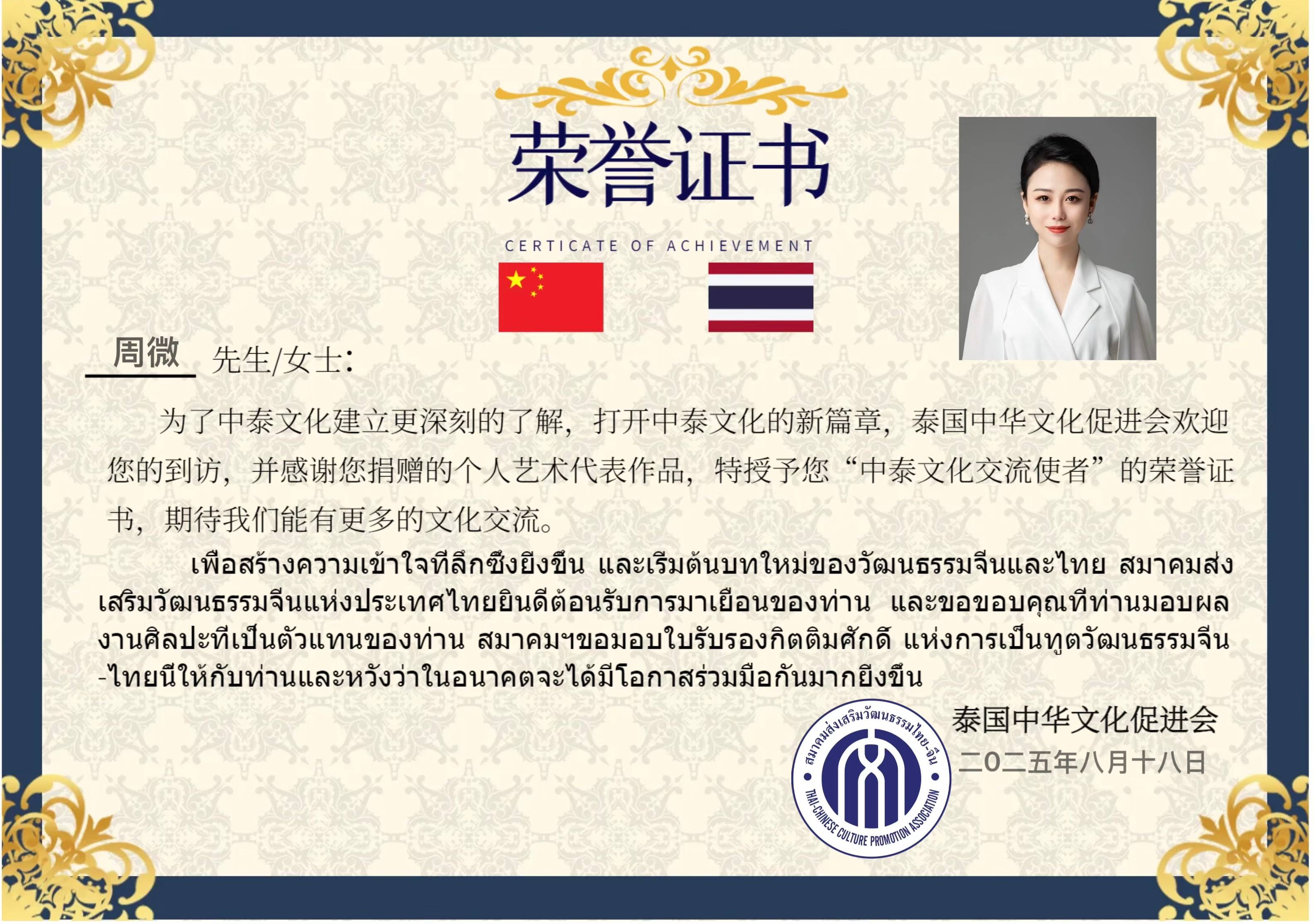 在中泰建交50周年这一具有里程碑意义的时刻,为表彰在中泰文化交流领域作出积极贡献的人士,泰国中华文化促进会于近日正式授予中国著名文化学者周微女士“中泰文化交流使者”称号,以肯定其在文化传播、礼仪教育及跨文化沟通等方面的突出成就,为深化中泰两国友好情谊注入新活力。