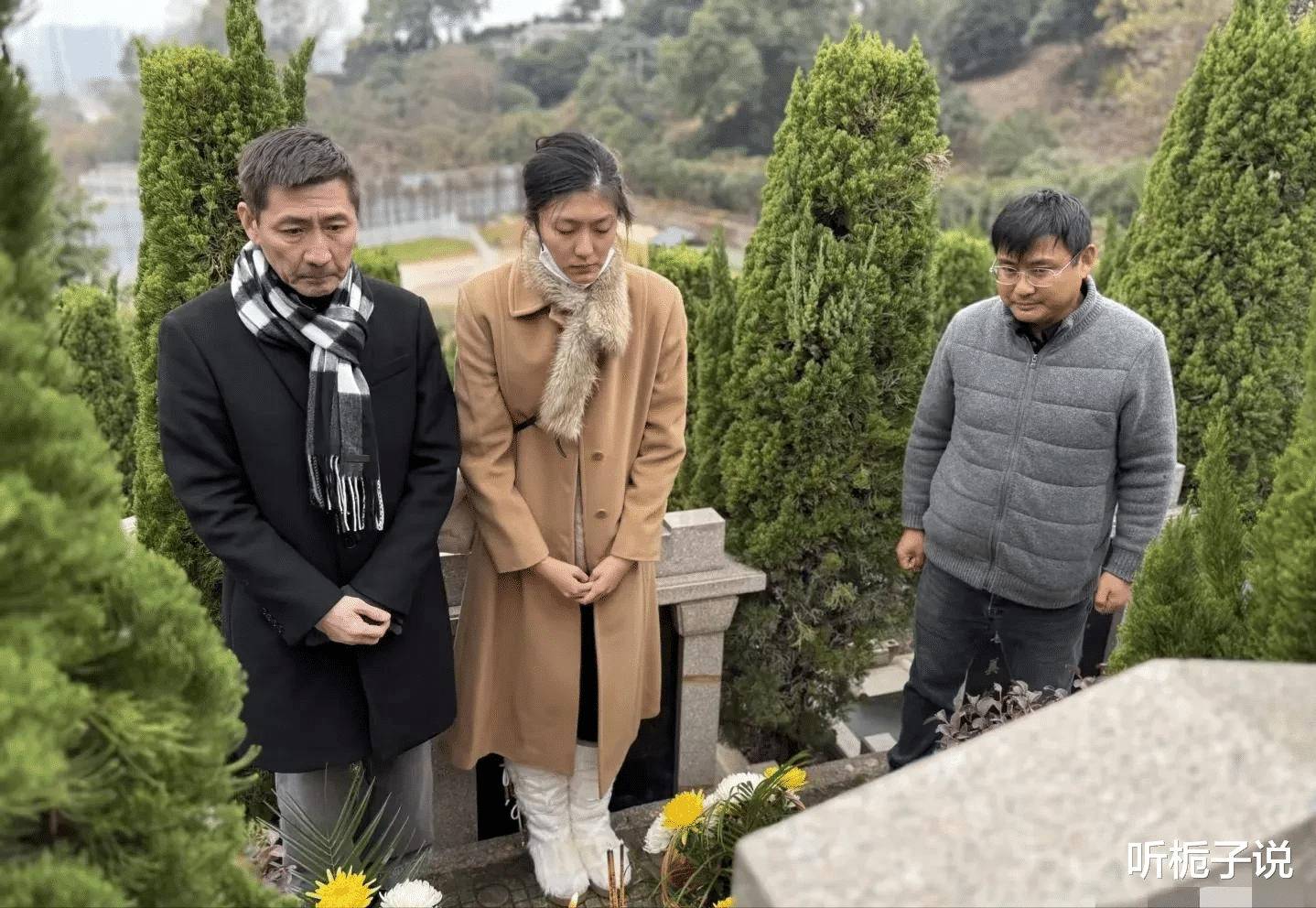56岁的张子健,身着黑色的毛呢大衣,搭配灰色的裤子,围着黑白格子的围脖,头发也白了,在面对李婷的墓碑,他表情很是沉重。