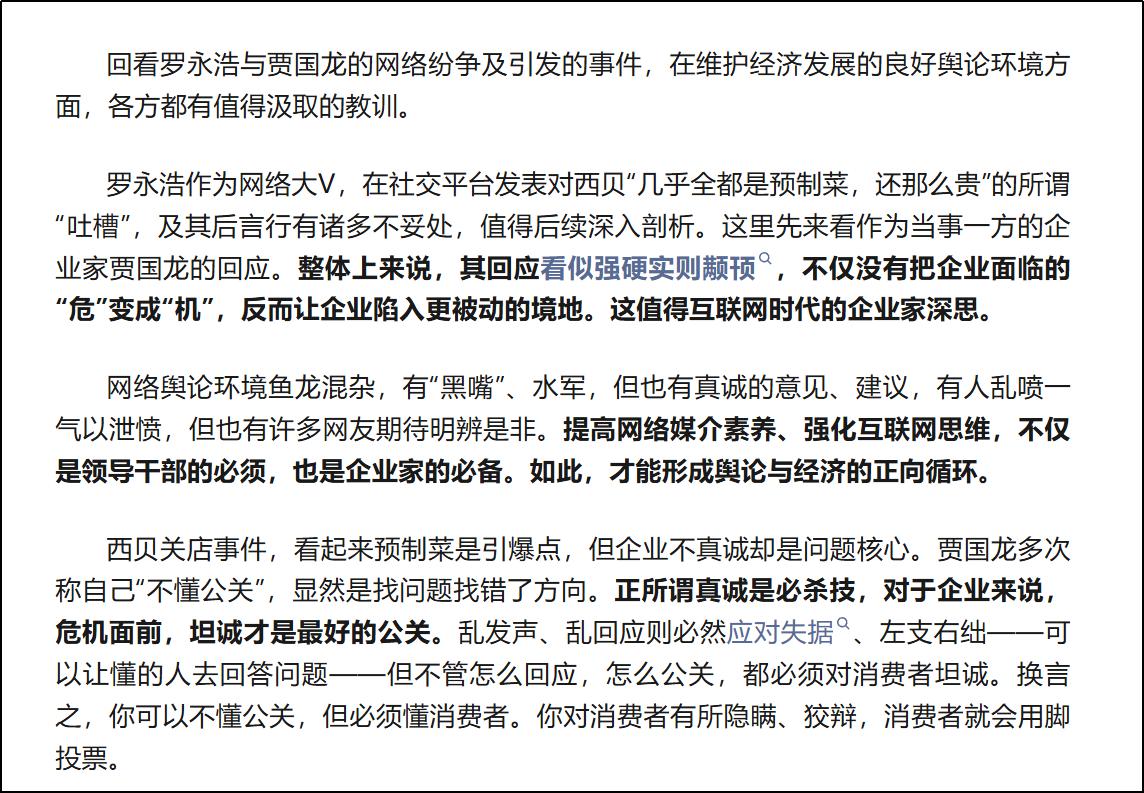 摘自《人民日报再评西贝关店事件:危机面前,坦诚是最好的公关丨筋斗云》
