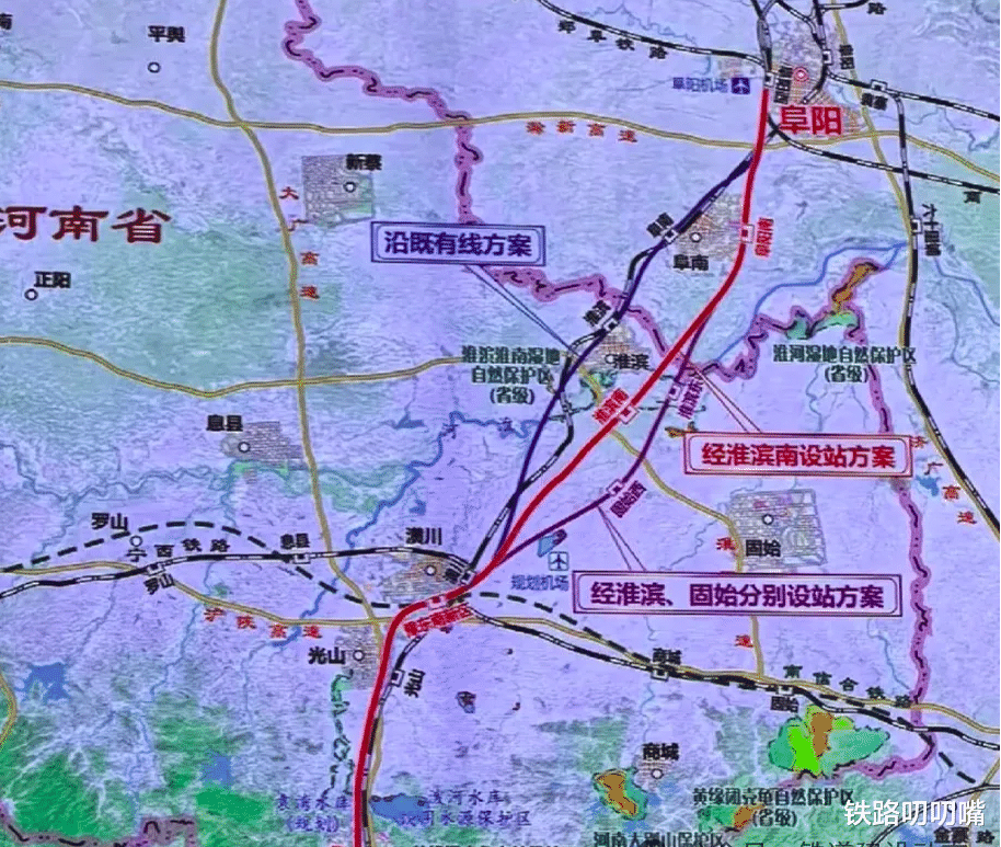 而河南段也开始了社会稳定风险调查公示,公示内容显示全线线路主要经过安徽的阜阳市颍州区、阜南、淮滨、潢川、光山、新县、红安、麻城、武汉新洲区及黄冈等地。其中最值得关注的是从公示信息来看,其中并没有提到经过固始县,看来在经淮滨南设站方案与经淮滨、固始分别设站方案的比选中,最终还是选择了前者。当然具体的设站方案还需待最终的可研批复为准。