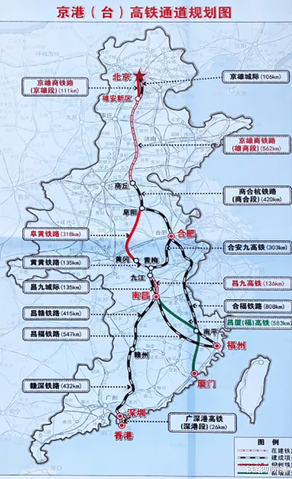 京港(台)通道是我国“八纵八横”高速铁路网主通道之一,主线由北京经合肥、深圳至香港(九龙),连接华北、华中、华东、华南地区;支线由合肥经福州延伸至台北,贯通京津冀、长江中游、海峡西岸、珠三角等城市群。