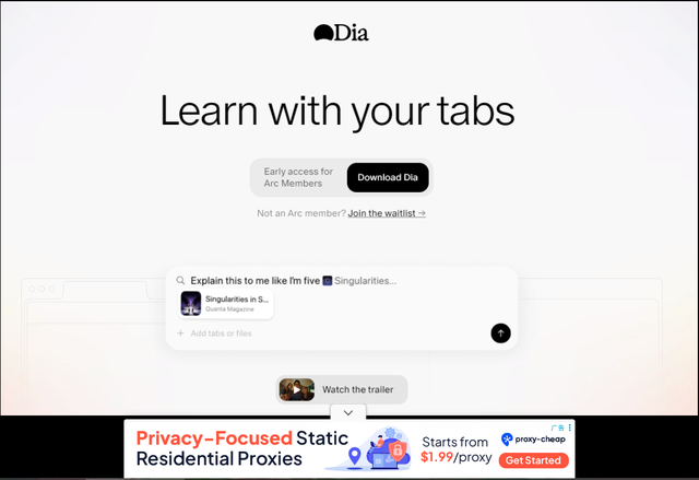 A、硅谷玩法:颠覆式革命,赌的是未来以Dia为代表的硅谷玩家,走的是“推倒重来”的路子——直接砍掉传统标签页,整个界面就一个搜索框,把AI深度融入浏览器底层,试图彻底颠覆现有操作逻辑。