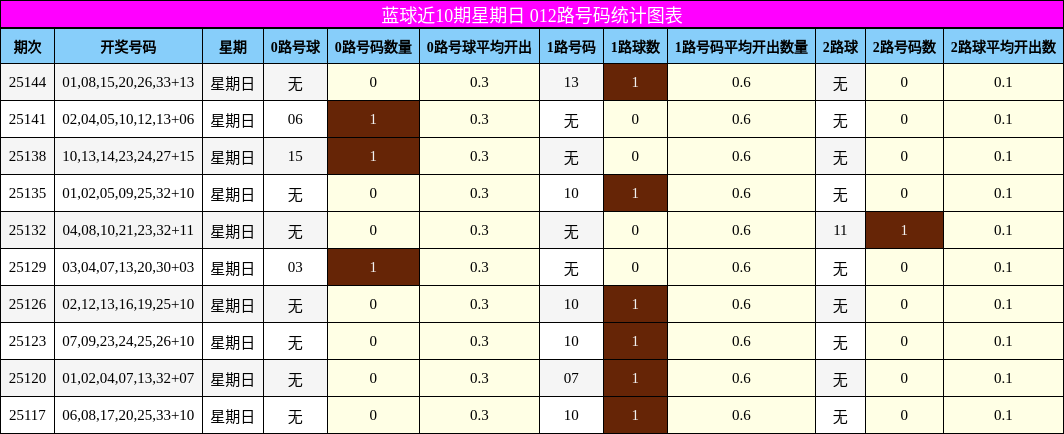 012路分析:1路冷出,胆码01成焦点近10期星期日蓝球012路分布显示:0路平均0.3个/期,1路0.6个/期,2路0.1个/期。1路占比高达60%,远超其他两路,但上期未出1路号码,形成“冷出”信号。