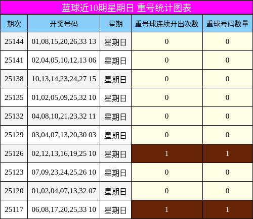 从图中可见,重号在近10期中仅在第1期和第4期出现,其余均为0,说明当前重号处于“冰点”状态,本期继续冷出的可能性极高,因此推荐中不包含上期蓝球02。