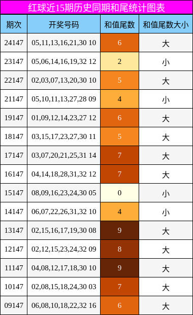 下图展示了近15期历史同期和尾的分布情况,可见尾数集中在5-9区间,但近期连续出现高位尾数后,低位尾数(如0、1、2、3)已连续多期未现,存在补缺可能。因此,本期和值尾数向小值靠拢的信号较为明确。