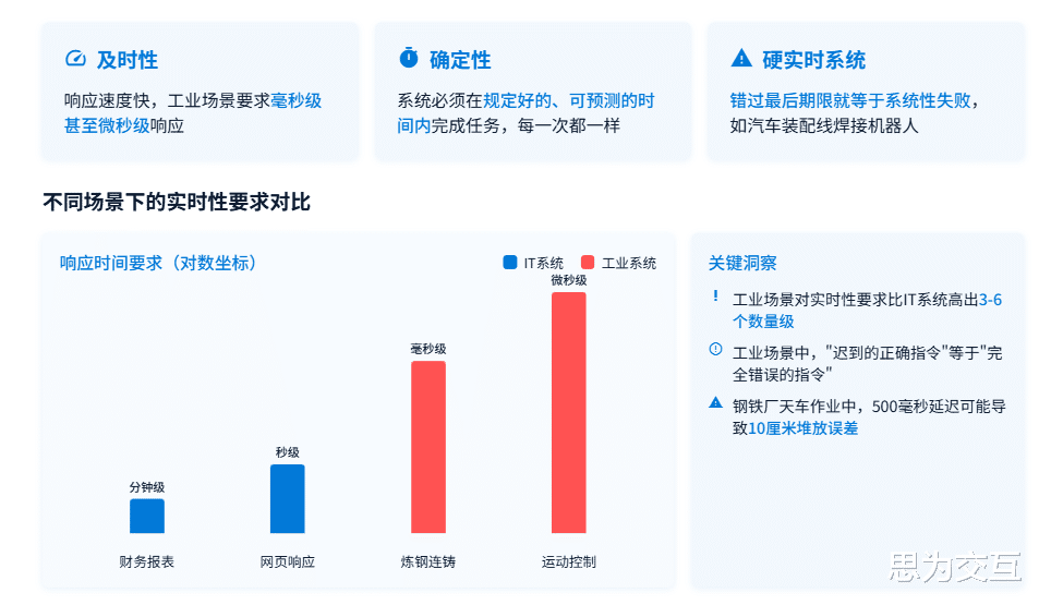 及时性好理解,就是响应速度快。但多快算快?在一条先进的炼钢连铸生产线上,对温度、压力等关键参数的采集时延,要求控制在5毫秒以内 。在一些高精度的运动控制场景,这个数字甚至要缩减到微秒级 。相比之下,传统IT系统秒级的响应,在工业控制领域就像是“慢动作回放”。