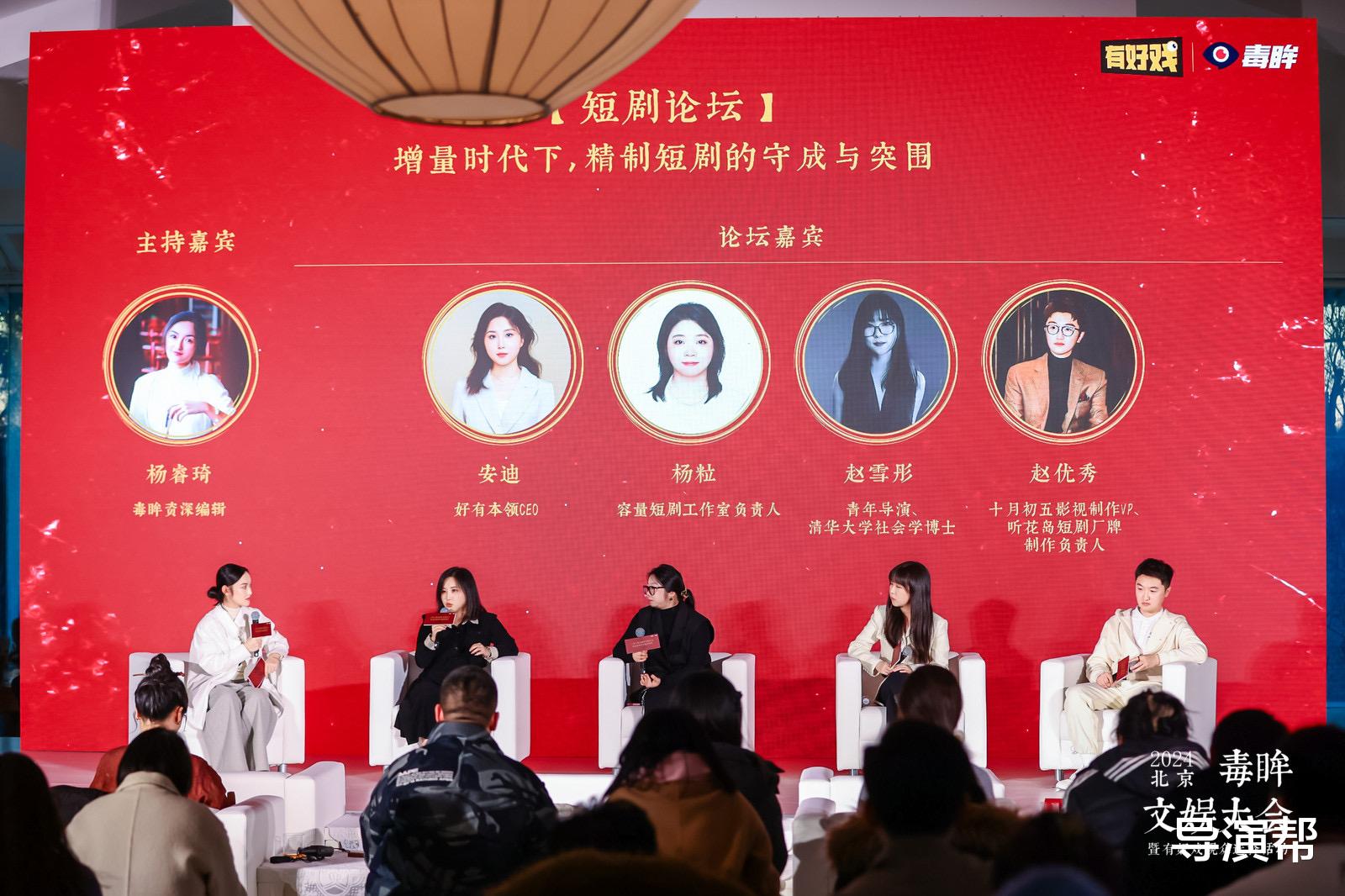 与电影同样作为面对C端的文娱产品,短剧在近年崛起,成为吸引用户的重要力量。好有本领CEO安迪;容量短剧工作室负责人杨粒;青年导演,清华大学社会学博士赵雪彤;十月初五影视制作VP,听花岛短剧厂牌制作负责人赵优秀受邀参加短剧论坛,共话“增量时代下,精制短剧的守成与突围”。毒眸资深编辑杨睿琦为本论坛嘉宾主持。