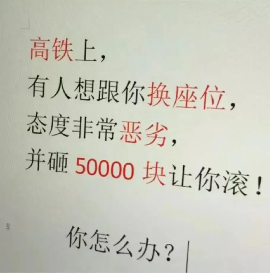 正确的做法是,把5万元当作两块砖头,用自己的脑袋去迎接它,必然会头破血流。然后在地上不停地打滚,迫使乘警带你去看医生,进而扣留此人。随后在医生那里就叫嚷自己头疼,脑袋受伤的事医生也不敢轻易判定无事,肯定会鉴定为轻伤。