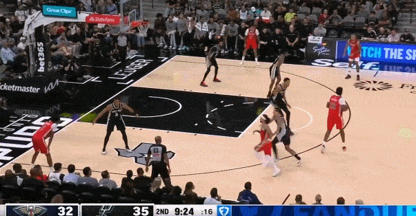 奎因的高位策应在本场展现得非常全面,鹈鹕在他高位持球时,保证了其他四人同步的无球跑位发挥他的传球能力,而奎因在这个回合的观察能力也展示得很好,本来阿尔瓦拉多是做pin down掩护想让琼斯提上打一个Chicago,但琼斯发现对手站位提前靠上,于是果断拒绝掩护跑了底线的空切,奎因迅速阅读到了这一点并且没有把手举高就把球甩了出去,目的很明显也是为了加快出球速度、躲避文班的长臂破坏球路。