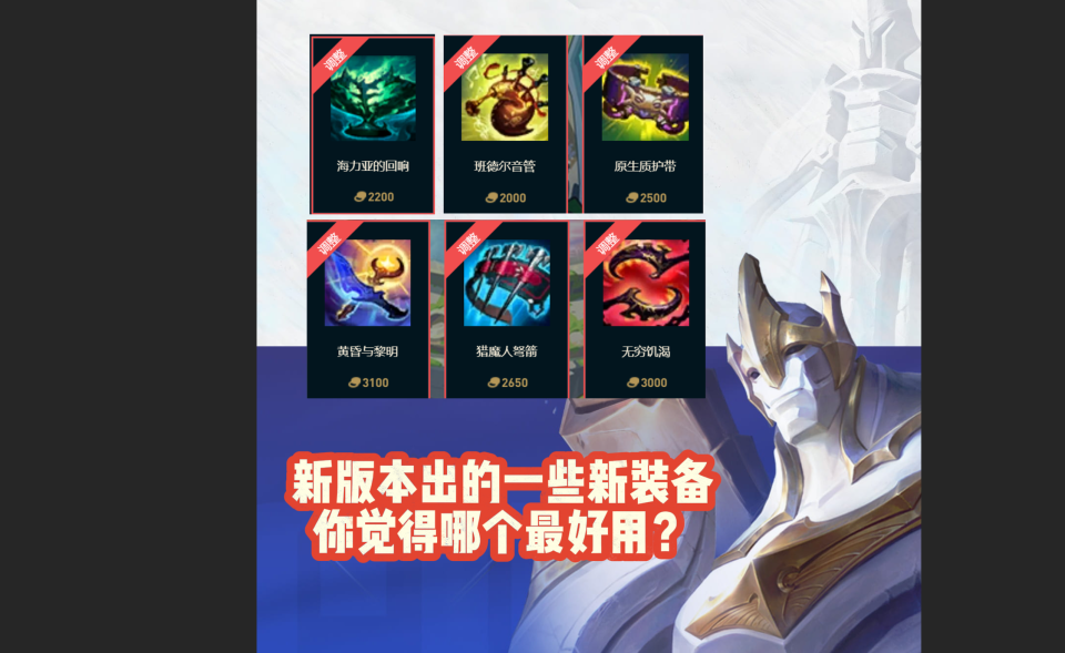其实最值得期待的还是德玛西亚的故事线,作为英雄联盟最伟大的城邦之一,在德玛西亚里有着很多故事线,不管是盖伦还是皇子,还是拉克丝等等等等,所以说26年是否能够等一次德玛西亚的动画片呢!在新版本里,更新了很多装备,尤其是平时最爱出的无终恨意,装备改了只有护甲和生命值,没有魔抗了,虽然只有那么一点点魔抗,但以前总会觉得多少有点就够用!同时还出了很多新装备的到来,有黄昏黎明、班德尔音管、原生质护带等等等等,不知道大家都用上没,觉得哪一个更好用?而新版本到来,福利肯定是不能少的!