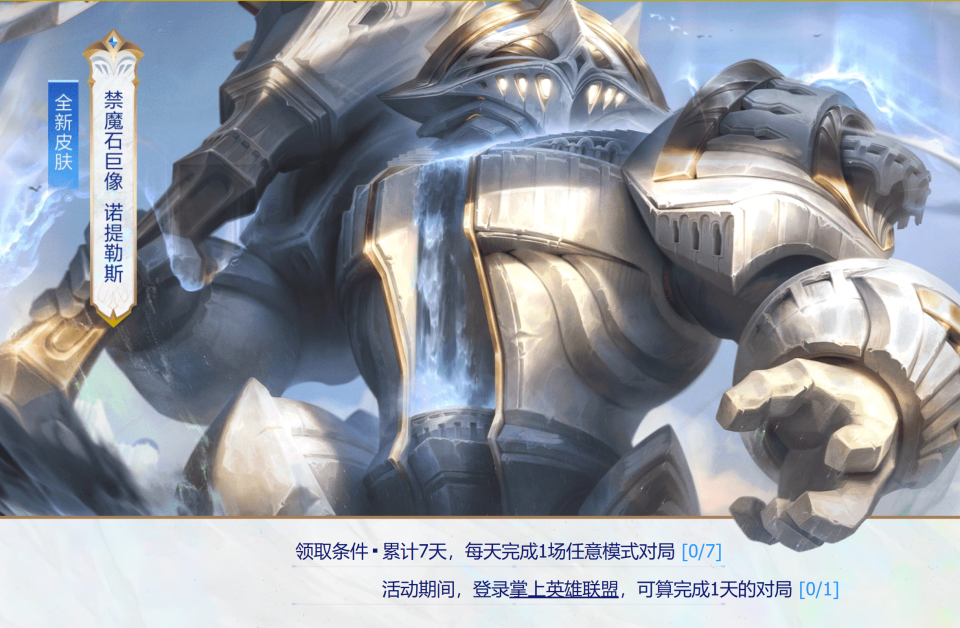 福利二:泰坦新皮肤禁魔石巨像,全新的一款皮肤,这不知道算是新赛季皮肤,还是会跟年限挂钩,毕竟现在距离春节也就1个多月,这一点先打个问号吧,大家只要累计七天每天完成一场对局,不管是什么对局都可以,不用连续,就可以领取到这款皮肤了!福利三:一款随机未拥有皮肤,只要完成10场海克斯大乱斗对局、或者15场任意模式对局都可以,但领取皮肤要在3月9日开启,时间有点点久!总体来看,这一波福利还是非常不错的,迎接全新赛季全新德玛西亚的到来,大家可千万不要错过哦!