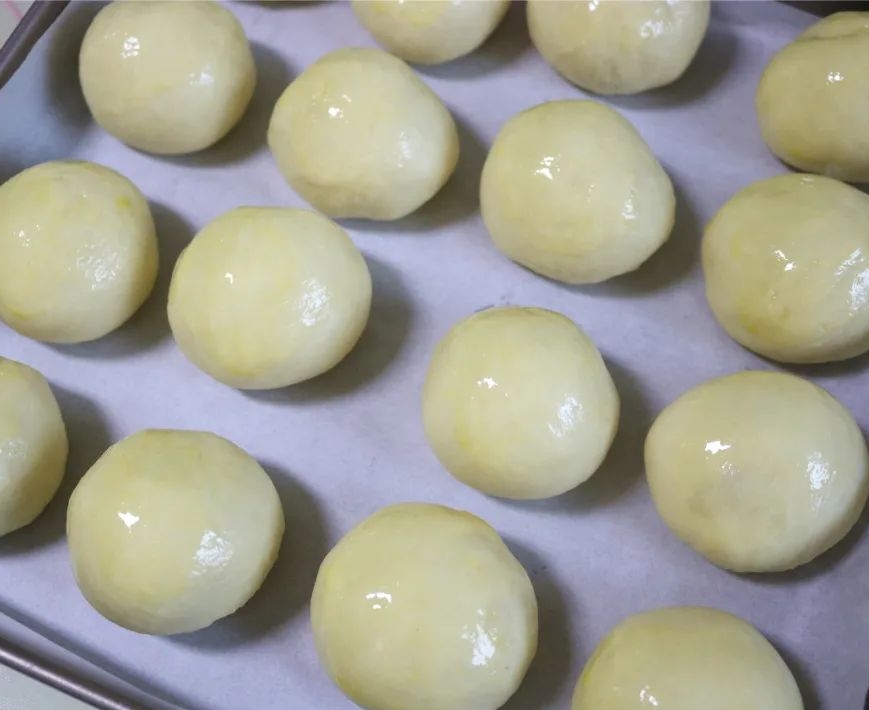 5. 将所有面团妥善处理妥当。在烤盘里铺上油纸,把面团以均匀的间隔摆放在烤盘上,随后盖上保鲜膜,放置到温暖的地方,醒发至两倍大。