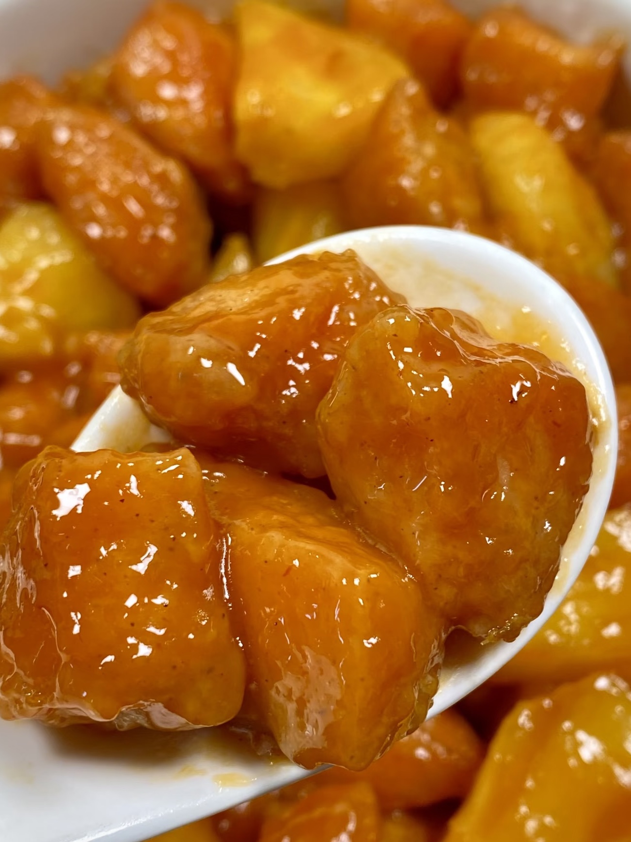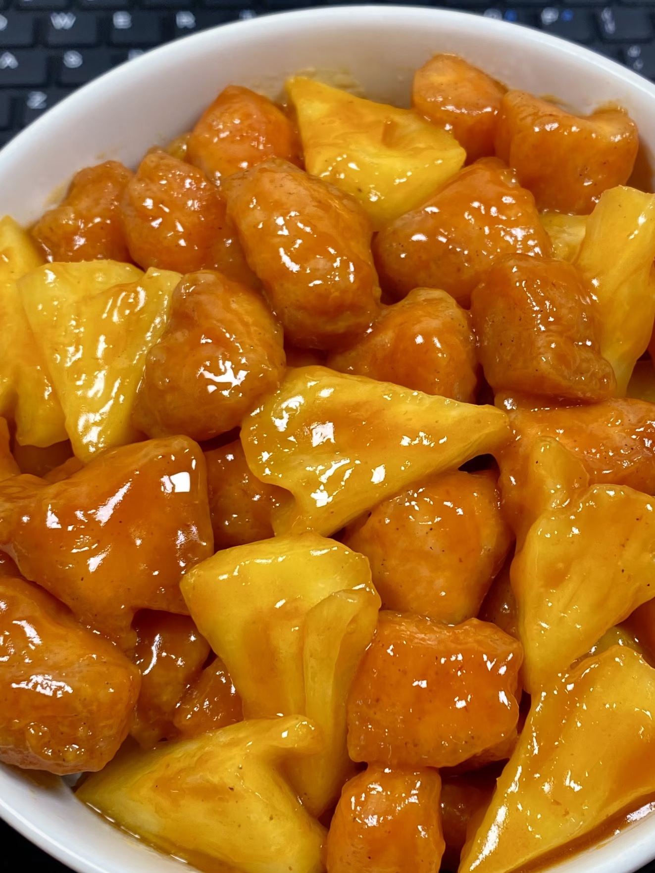 锅里留底油,小火倒入调好的酱汁,边加热边用铲子画圈,淀粉一受热就“咕嘟”冒泡,颜色从粉红变成晶亮橙红,像夕阳融化在锅里。此时立刻把菠萝、彩椒、肉丁全倒进去,转大火快速翻炒15秒,让每一块都裹上玻璃芡,菠萝边缘微微透明,果肉里的酸甜汁被酱汁逼出来,果香+酱香+肉香三香合一,锅铲自己都想先尝一口。