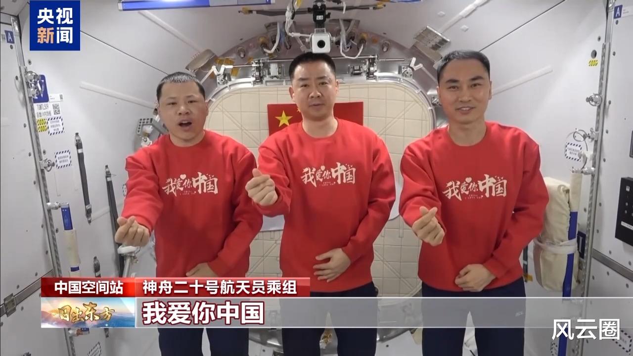 太空中传来喜讯!就在全国人民欢度国庆之时,神舟二十号的三位航天员身穿醒目的“我爱你中国”文化衫,从遥远的太空为祖国送上生