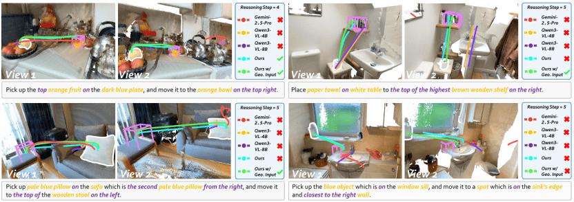 下面展示一些 RoboTracer 与其它模型输出结果的可视化样例,不难发现目前的 VLM 都理解空间关系并且生成 2D 轨迹,但是由于绝对深度预测不精确导致生成的空间轨迹往往浮空或者碰撞,而 RoboTracer 可以较为精确地预测,而且更多的几何输入预测结果更精确。