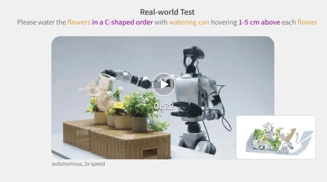 想象一下你下班回到家,对家用服务机器人说: 「按从左到右的顺序给每盆花浇水;喷壶要在每朵花上方 1–5 厘米处停住再浇,这样更均匀。」(如下图)