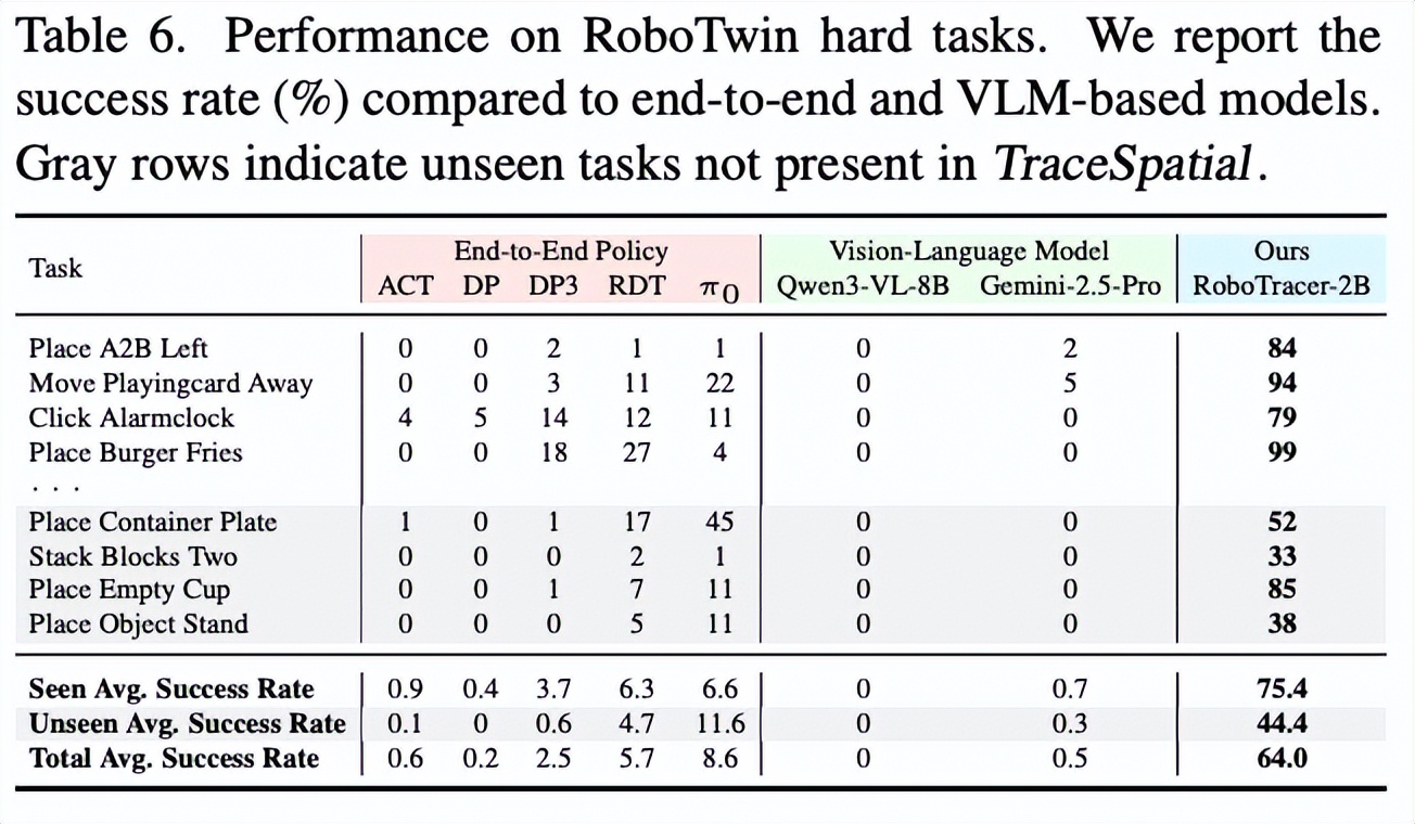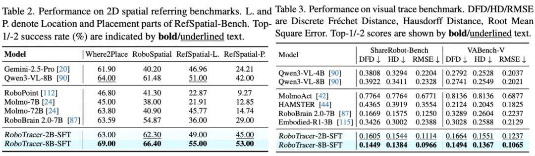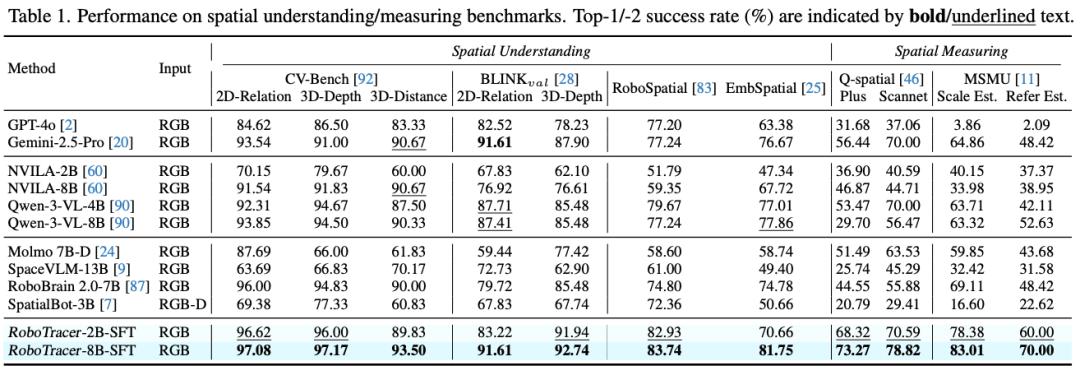 SFT 训练下的 RoboTracer 在空间理解 / 空间度量 / 空间指代任务中达到了 79.1% 的平均成功率,取得了当前最先进水平,比 Gemini-2.5-Pro 高出 11% 的平均准确率。