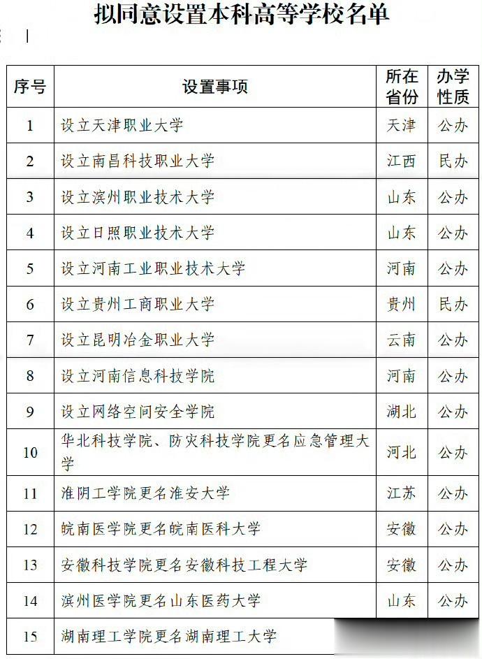 2026年新年伊始,1月4日,教育部官网发布《关于拟同意设置本科高等学校的公示》,宣布拟同意设置包括天津职业大学、应急管理大学(由华北科技学院与防灾科技学院合并)在内的15所学校。这份名单不仅意味着一批新大学的诞生,更折射出国家在人才培养战略上的深远考量。