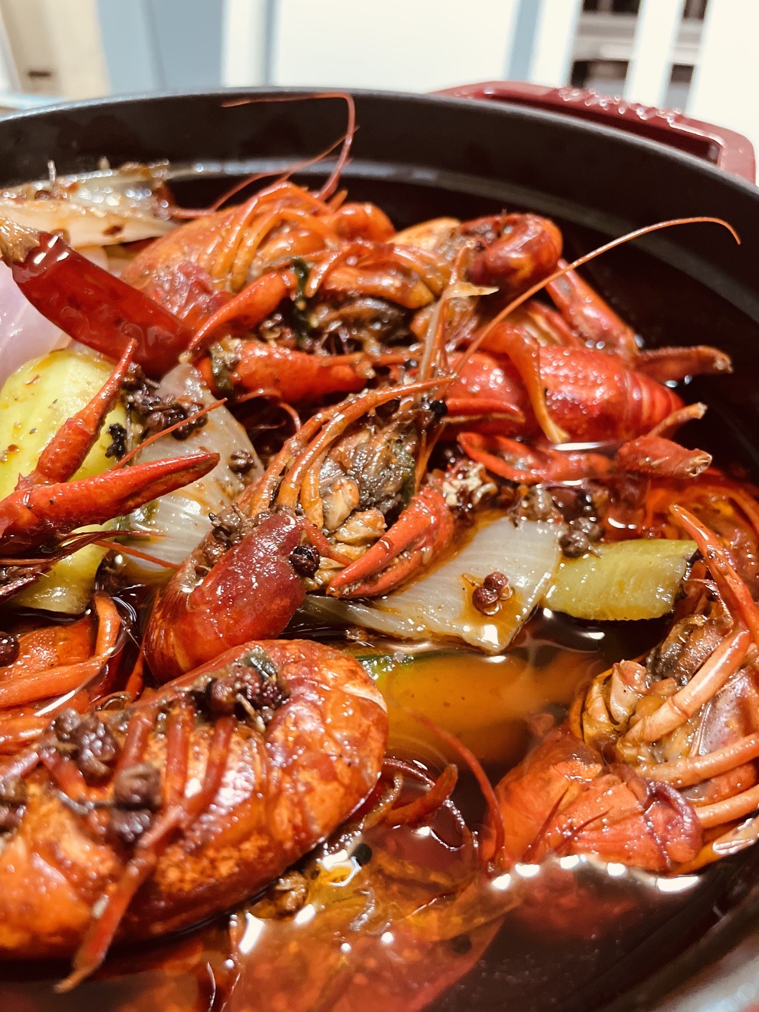 在焖煮的时候可以加入自己喜欢的配菜,比如土豆片、年糕、藕片、玉米,吸饱了汤汁的配菜同样美味。不过要注意配菜易熟,不要和虾一起下锅,否则容易煮烂。