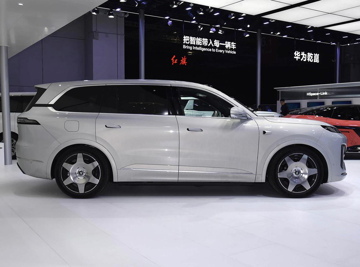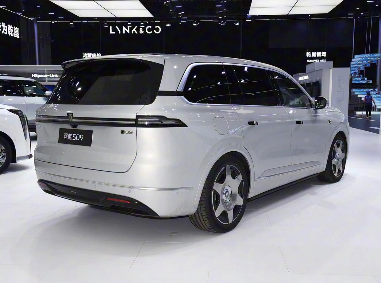 车身侧面,全新深蓝S09也给人一种稳重的姿态,弧线形的车顶、银色的车窗饰条,黑色的B柱/C柱与全黑色隐私玻璃融为一体,为了凸显出它的与众不同,还在D柱加入了黑色隔断的设计,上面还带有“DEEPAL”标识,彰显独特身份。车身简洁流畅,隐藏式的门把手不仅降低了风阻,还提升了整体的美观度。前翼子板处加入了身份铭牌,倒车镜也采用了双色设计,水滴形的设计也更加优雅,每一处细节都经得起推敲。作为旗舰9系车型,全新深蓝S09车身的长宽高5205/1996/1800毫米,轴距达到3105毫米,与竞品理想L9尺寸非常接近。据了解,该车还提供20英寸和21英寸两种轮毂选择,满足不同消费者的个性化需求。