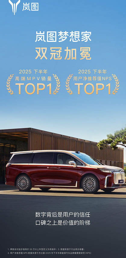双冠的背后,是两种截然不同的胜利:销量第一,是产品在广阔市场中经受住严苛检验的证明,意味着岚图梦想家已通过市场检验,成为消费者用真金白银投票的成熟产品;NPS第一,则意味着岚图梦想家成为用户心中最值得推荐的新能源MPV,形成了口碑效应与圈层认同,在用户心智中构筑了难以撼动的信任与偏好。两者合一,标志着岚图梦想家完成了从“被选择”到“被推崇”的质变。凭借这双重权威认证,岚图梦想家正在重新系统性定义高端MPV的价值体系和价值标尺。