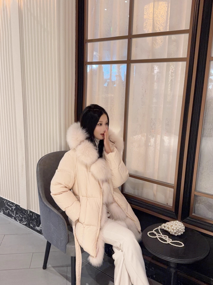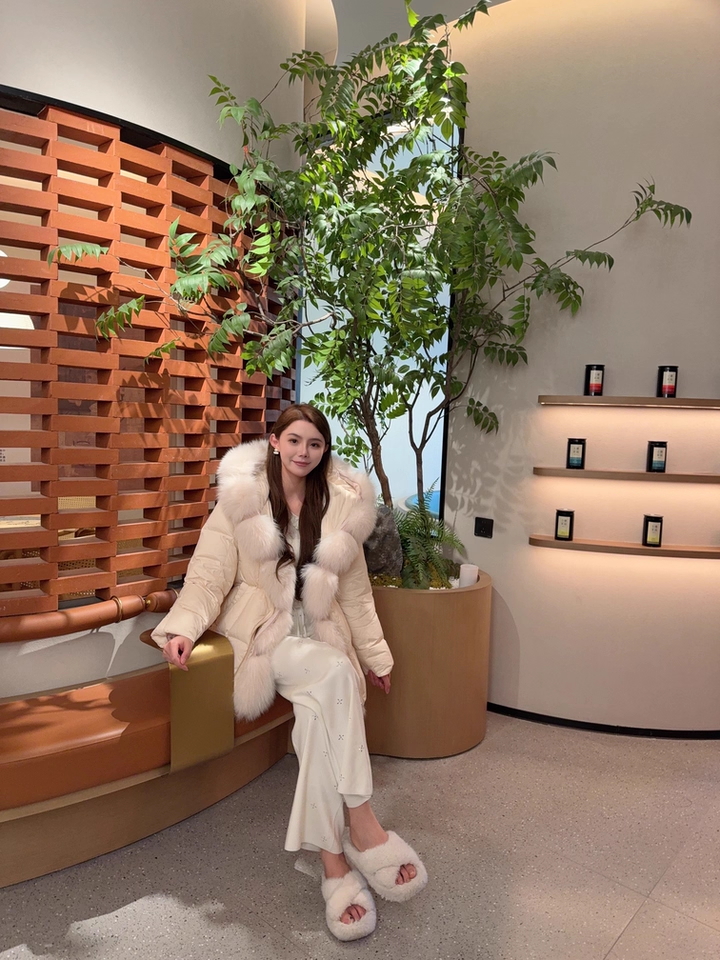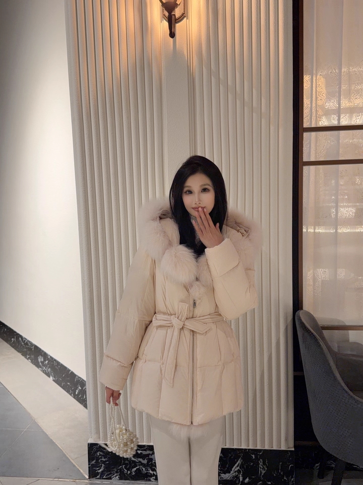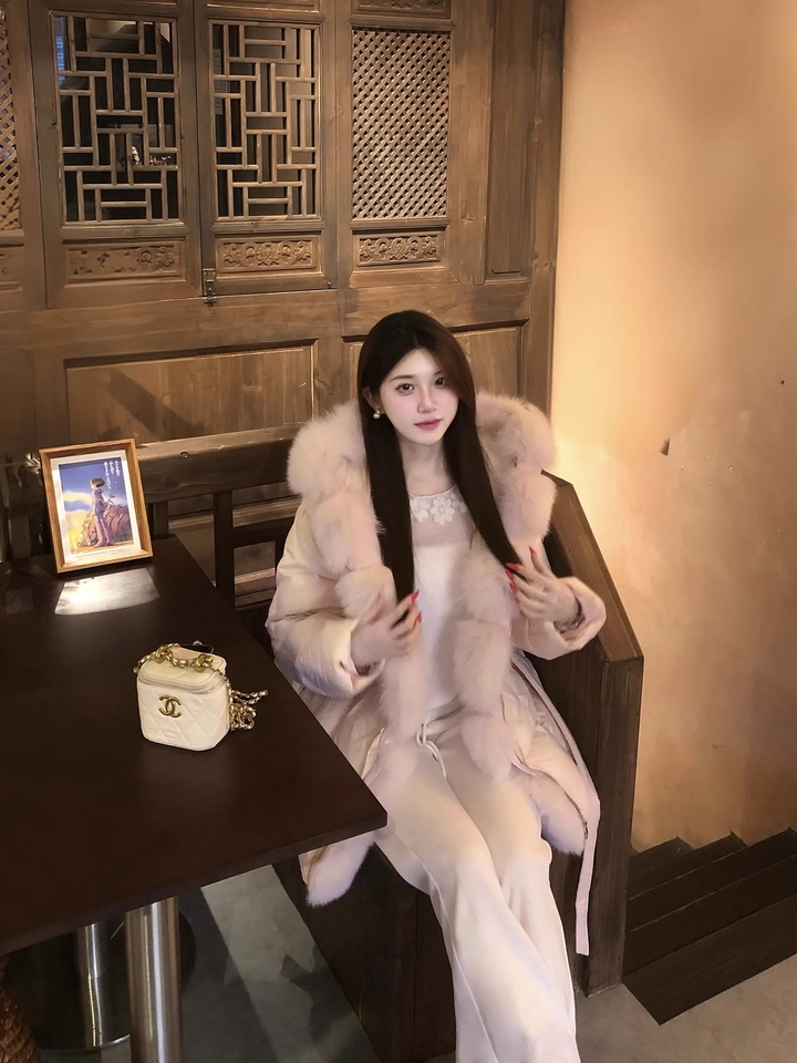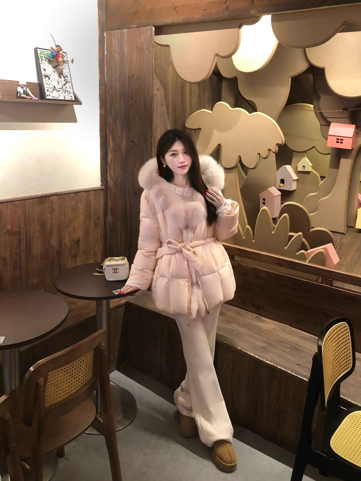 浅粉色羽绒服通过腰间系带巧妙勾勒出清晰腰线,毛领增添柔美气质,内搭蕾丝细节隐约可见。下着同色系阔腿裤与棕色厚底鞋,营造出轻盈又保暖的冬日层次感,手提精致小包,整体甜而不腻,温柔可人。此造型为甜美温柔风,融合了少女感的粉色调、女性化的蕾丝与毛领元素,通过宽松裤装与厚底鞋平衡甜度,适合日常通勤、约会等冬日场合。