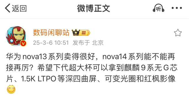 此次华为 Nova 14 系列将发布三个版本,具体依次为Nova 14、Nova 14 Pro、Nova 14 UItra;意味着,华为在产品布局上更加注重高端市场的覆盖。