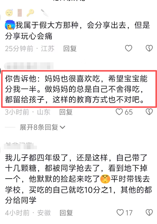 所以大家觉得在外面这种表现是合理的,是一种礼貌,可是家长却私底下给他们传输了另一种观点,那就是不要随便把自家的好东西分给别人,外人注定是外人。