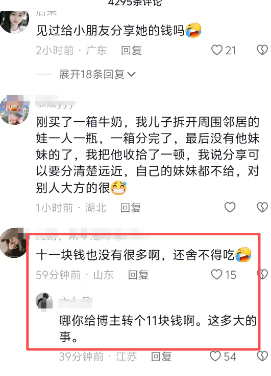 当然我们能想象到评论区里又有一些家长嘲讽或者批评这位妈妈,说11块钱的面包你都舍不得之类的话,大家可能确实有一点何不食肉糜了。