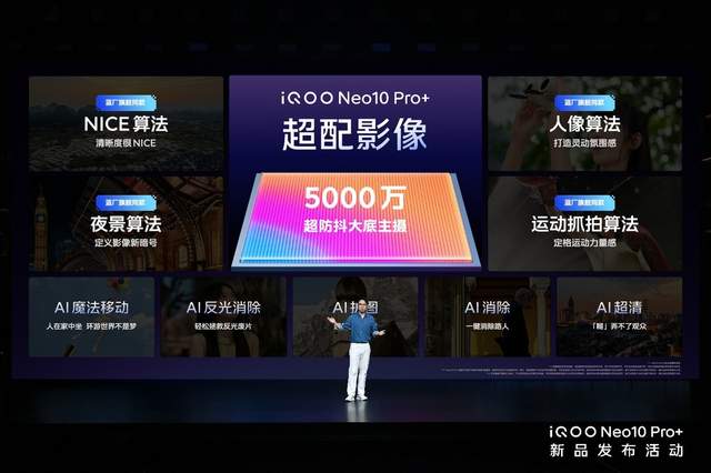 影像方面,Neo10 Pro+ 具备 5000 万像素超防抖 1/1.55" 大底主摄,搭配独家定制的OIS超级光学防抖和新一代 VCS 人眼仿生技术,并拥有蓝厂旗舰同款的夜景、人像和运动抓拍等 NICE 算法加持,让你随手就能拍出质感大片,还有 AI 修图大师为你拯救废片,玩出创意好片。Neo10 Pro+ 亦有当下热门的动态照片,同样支持 NICE 算法,还支持动态水印,并能轻松分享到微信朋友圈、小红书、微博和抖音,让照片更时髦。