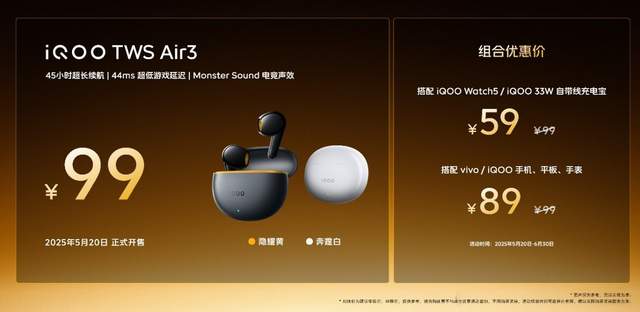 iQOO TWS Air3 具有“隐耀黄”和“奔霆白”两款配色,3.6g 单耳机佩戴轻盈舒适,支持 IP54更能安心使用;支持 LC3 音频编码,可实现全链路游戏 44ms 和耳机端 15ms 的低延迟;耳机单次听歌可达 10 小时,单次游戏可玩 6.5 小时,配合耳机盒可长达 45 小时听歌续航,而充电 10 分钟,就可连手机畅玩游戏2 小时,真正做到充得快、玩得久;拥有 12mm 高解析复合声音单元,具备空间音频、Monster Sound 电竞声效和 DeepX 3.0 立体声效,无论听歌还是玩游戏,都能带来更好聆听声效;支持蓝牙 6.0 多设备双连接和无线 K 歌耳返,并融入 BlueOS 生态,与生态内设备实现智联互通,是 vivo / iQOO 手机的极佳拍档。