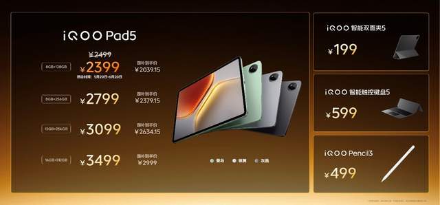 iQOO Pad5 系列共有“曼岛”、“灰晶”和“银翼”三种配色可选,iQOO Pad5 Pro 提供 8GB+256GB、12GB+256GB、12GB+512GB 和 16GB+512GB 四种存储组合可选,到手价 3199 元起,iQOO Pad5 提供 8GB+128GB、8GB+256GB、12GB+256GB 和 16GB+512GB 四种存储组合可选,到手价 2399 元起;iQOO WATCH 5 到手价 799 元起;iQOO 磁吸散热背夹 Pro、iQOO TWS Air3和 iQOO 33W 自带线充电宝到手价分别是 199 元起、99 元起和129 元起。各款 IoT 设备搭配 iQOO Neo10 Pro+ 组合购买还能享受更多优惠。