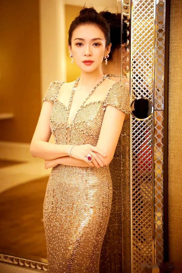 章子怡,一身金色修身长裙,隔着屏幕都挡不住的大花压迫感