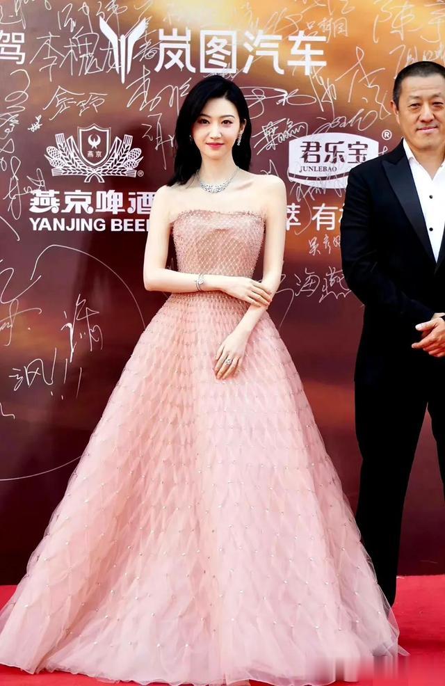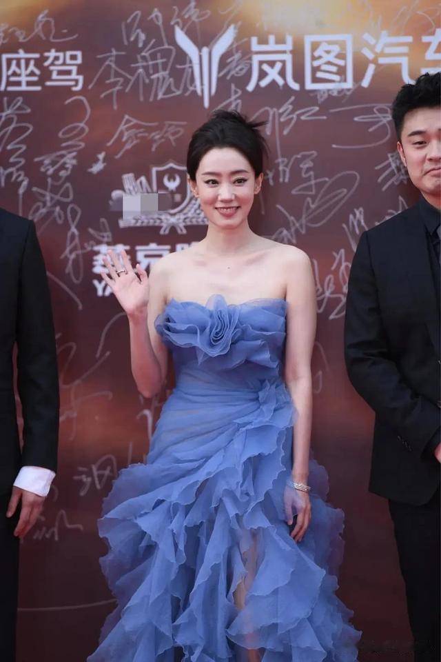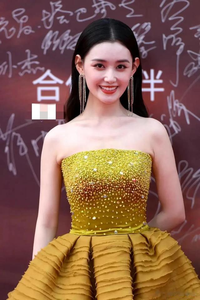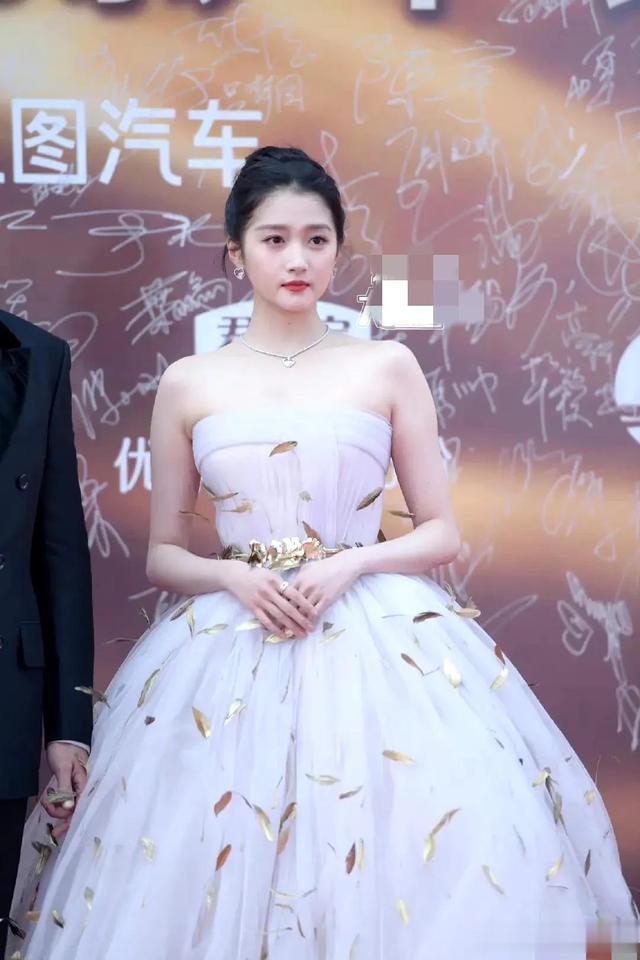 关晓彤,抹胸纱裙,金色叶子点缀其中,再加同色系的腰带,造型虽然中规中矩,但也很美了