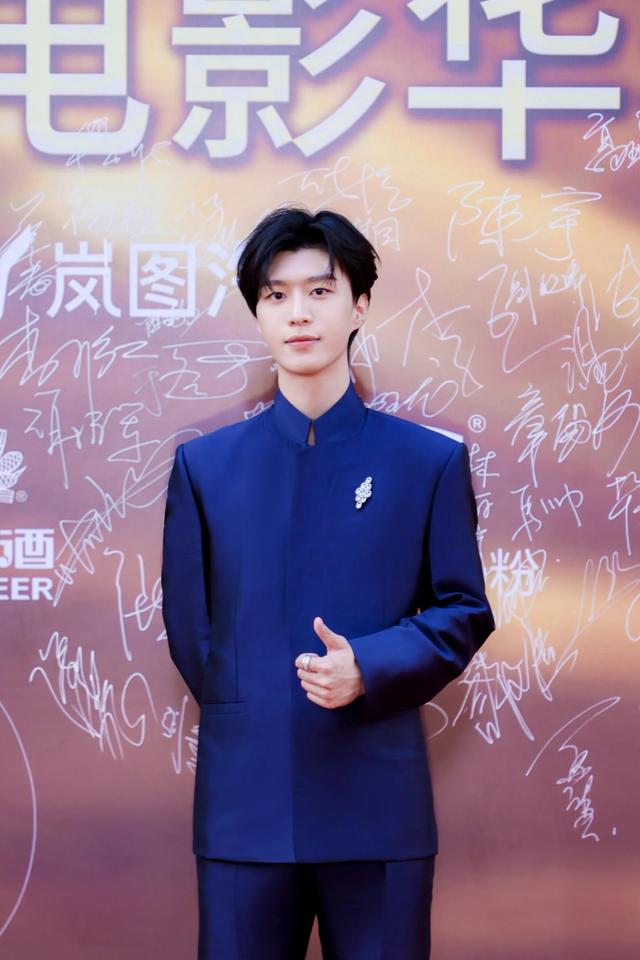 范丞丞,蓝色中山装,胸前胸针点缀,很有豪门弟弟的乖巧感