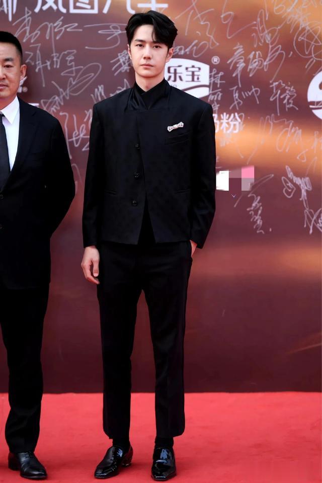 王一博,黑色暗纹西装,搭配蝴蝶钻石胸针,真的很亮眼了