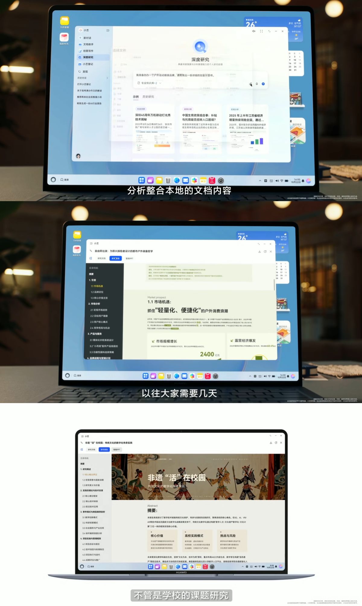 如今的小艺不仅融于日常生活,甚至还在更专业的办公、学习场景中,成为我们不可或缺的搭子。比如我们经常需要完成写报告、做调研或者规划项目等各种复杂任务。现在鸿蒙电脑跟网页版小艺能够体验到小艺深度研究,就像专业的个人研究助理,能帮我们节省大量时间。假设我要准备一份商业计划书,只需告诉小艺需求,它就能自动搜索全网资料,分析上千份文档,并结合专业知识库生成详细方案。更关键的是,它不仅收集信息,还能推理出创新建议以及可行性强的解决方案,最后输出图文并茂的研究文档或PPT。