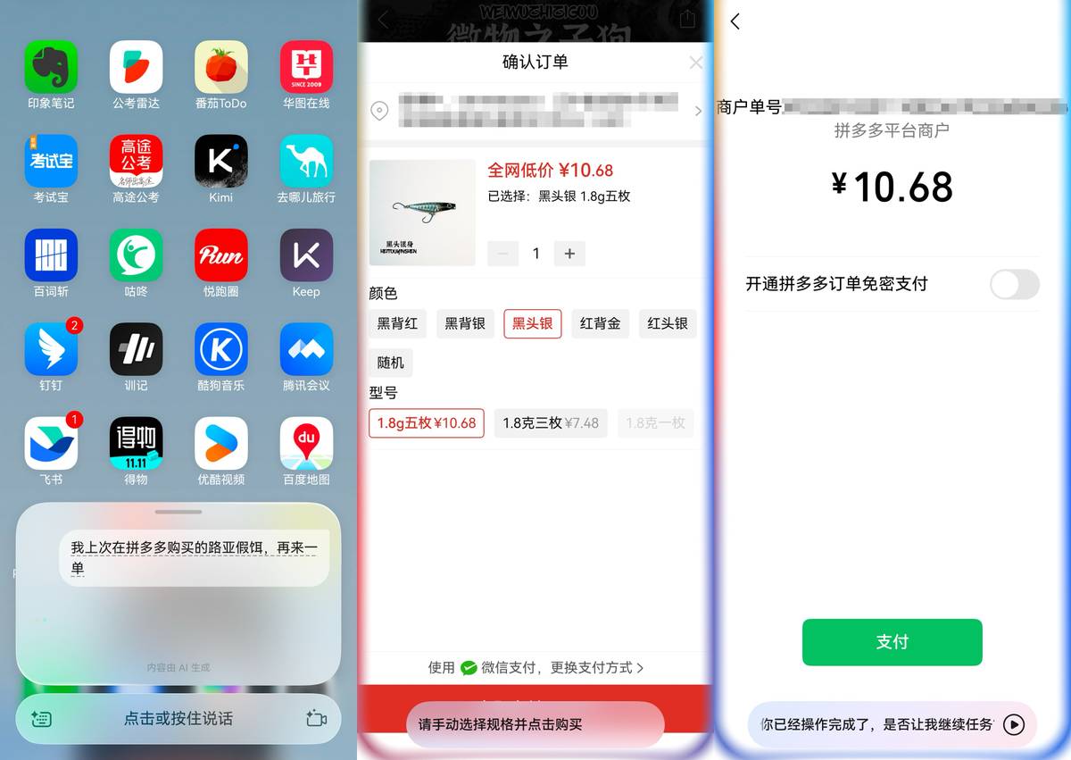 除了修图和深度研究这类专业技能,小艺在其他方面也变得更加智能、贴心。它现在支持多种方言自由对话,例如四川话、粤语和上海话等,家里老人用起来也没压力,让科技更贴近生活。小艺帮帮忙功能则是能把复杂任务变简单化,比如你正忙着做饭,突然发现忘了买晚上钓鱼要用的鱼饵,但又腾不出手操作,只需对小艺说一句:上次在拼多多买的路亚假饵再来一单,它就会自动处理。直到选规格、付款这步,才需要你手动操作一下。这种多任务执行能力,让生活琐事变得省心省力。