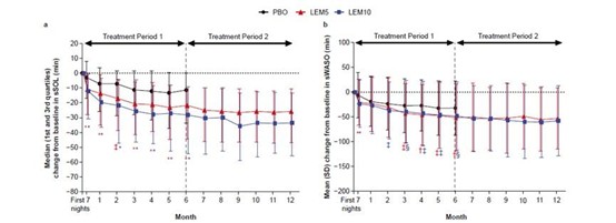 (2)和安慰剂相比,5mg和10mg的莱博雷生以使失眠患者自我感知的从入睡到醒来(排除夜间清醒时间)的实际睡眠总时长延长6.4分钟和18.4分钟。