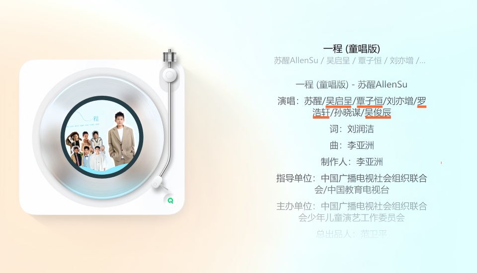 “小手牵大手《童唱新时代》”活动近日再推佳作,乐维艺术团成员吴启呈、覃子恒、罗浩轩、吴俊辰与知名歌手苏醒共同演绎的歌曲《一程》(童唱版)正式登陆QQ音乐、酷狗音乐、酷我音乐三大音乐平台!
