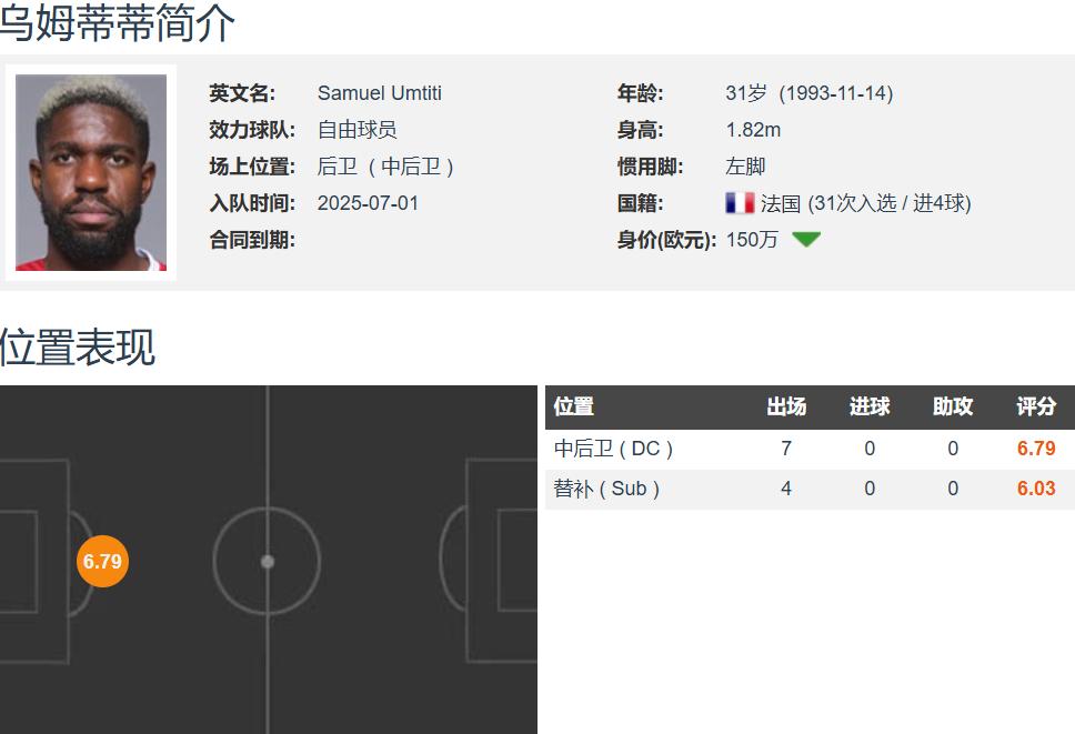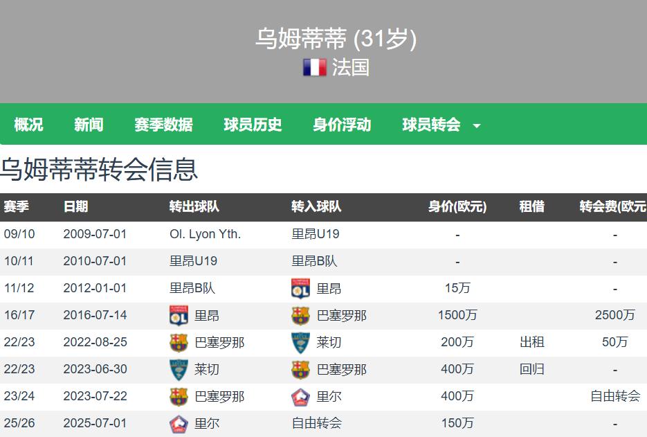 乌姆蒂蒂职业生涯最高身价高达7000万欧元,是同期足坛身价最高的中卫,可惜抵不过伤病,这位前足坛前三中卫就这样如同流星一般,闪亮过,但一瞬而逝。乌姆蒂蒂目前在德转的身价仅有150万欧元,31岁的中卫对于现代化足球而言,还是当打之年。一声叹息,可惜了。