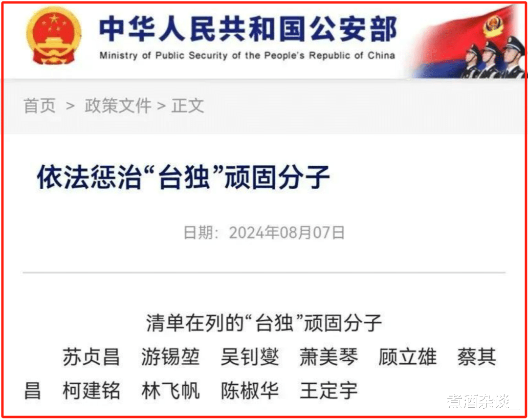 1.赖清德是极少数“台独”分裂分子。目前,公安部依法通缉的“台独”顽固分子包括:萧美琴、顾立雄、柯建铭、吴钊燮等人。国台办还宣布制裁沈伯洋等人。