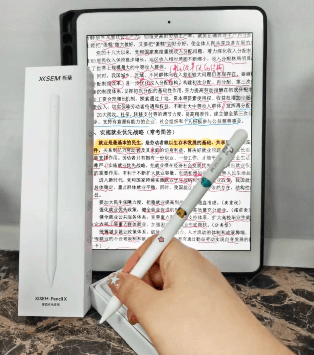 性能上,西圣电容笔采用了高灵敏度芯片,确保落笔几乎无延迟,真正模拟纸上书写的感觉;书写上,采用了和Apple pencil相同做工材质的pom笔尖,能够有超98%以上还原Apple pencil书写体验;画画上,其倾斜压感技术能够根据不同力度,实现线条粗细的灵活变化,特别适合绘画与创作需要。同时还配备了全局防误触设计,即使手掌自然放置在屏幕上,也不会出现误触。