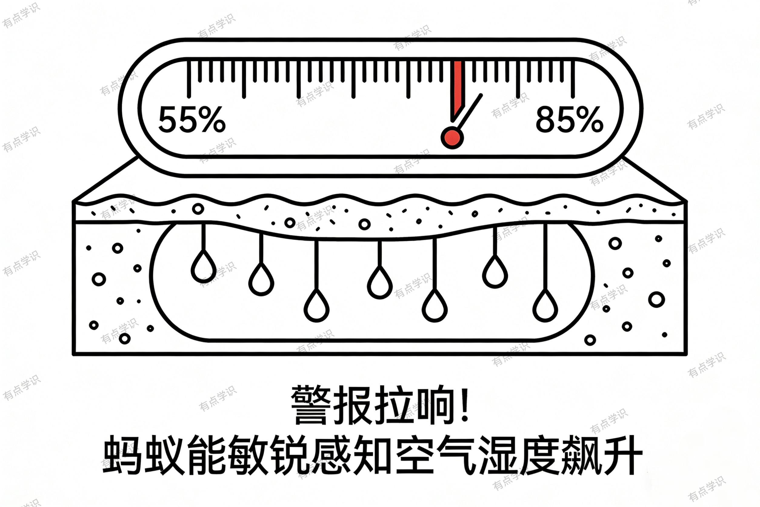 蚂蚁巢穴拥有独特的微环境。下雨前,空气湿度会显著升高。蚂蚁的身体(特别是触角)能敏锐捕捉到这种变化。当巢内变得过于潮湿,会威胁到蚁卵和幼虫的生存,必须立刻行动!