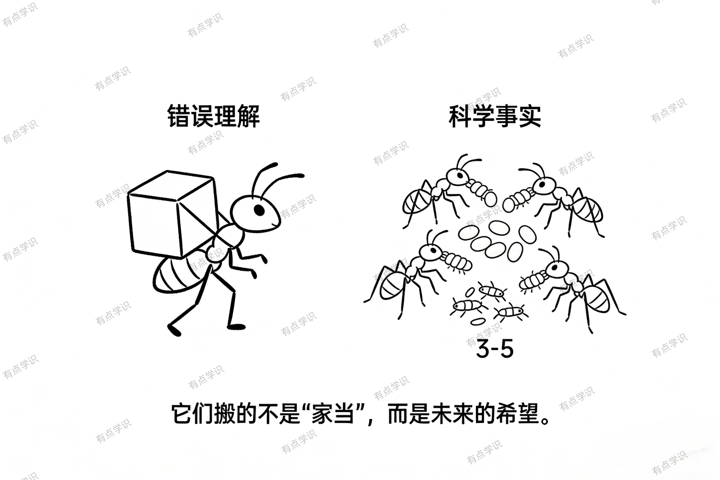 蚂蚁雨天搬迁的核心任务是转移种群未来。优先搬运蚁后产的卵和需要恒温恒湿环境的幼虫,其次是食物储备。蚁巢本身(地下隧道)很难快速搬走,它们是在寻找新的安全据点。