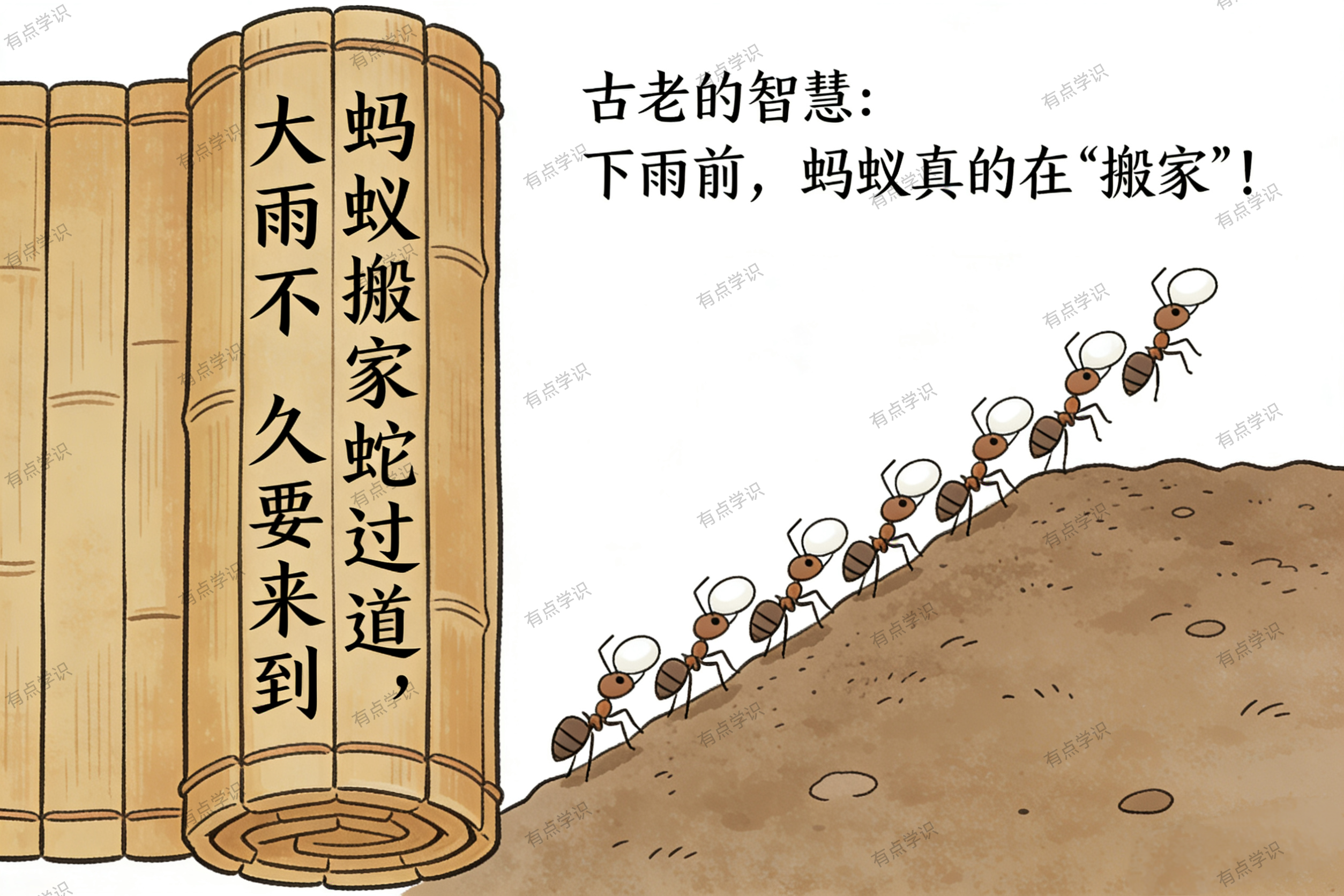 科学研究观测到,在干燥季节,蚂蚁活动频繁。但当空气湿度持续高于一定阈值(例如80%),预示着大雨将至,蚂蚁的户外觅食等活动会显著减少,甚至停止,能量集中于巢内防洪准备。这是对谚语的精准数据化验证。