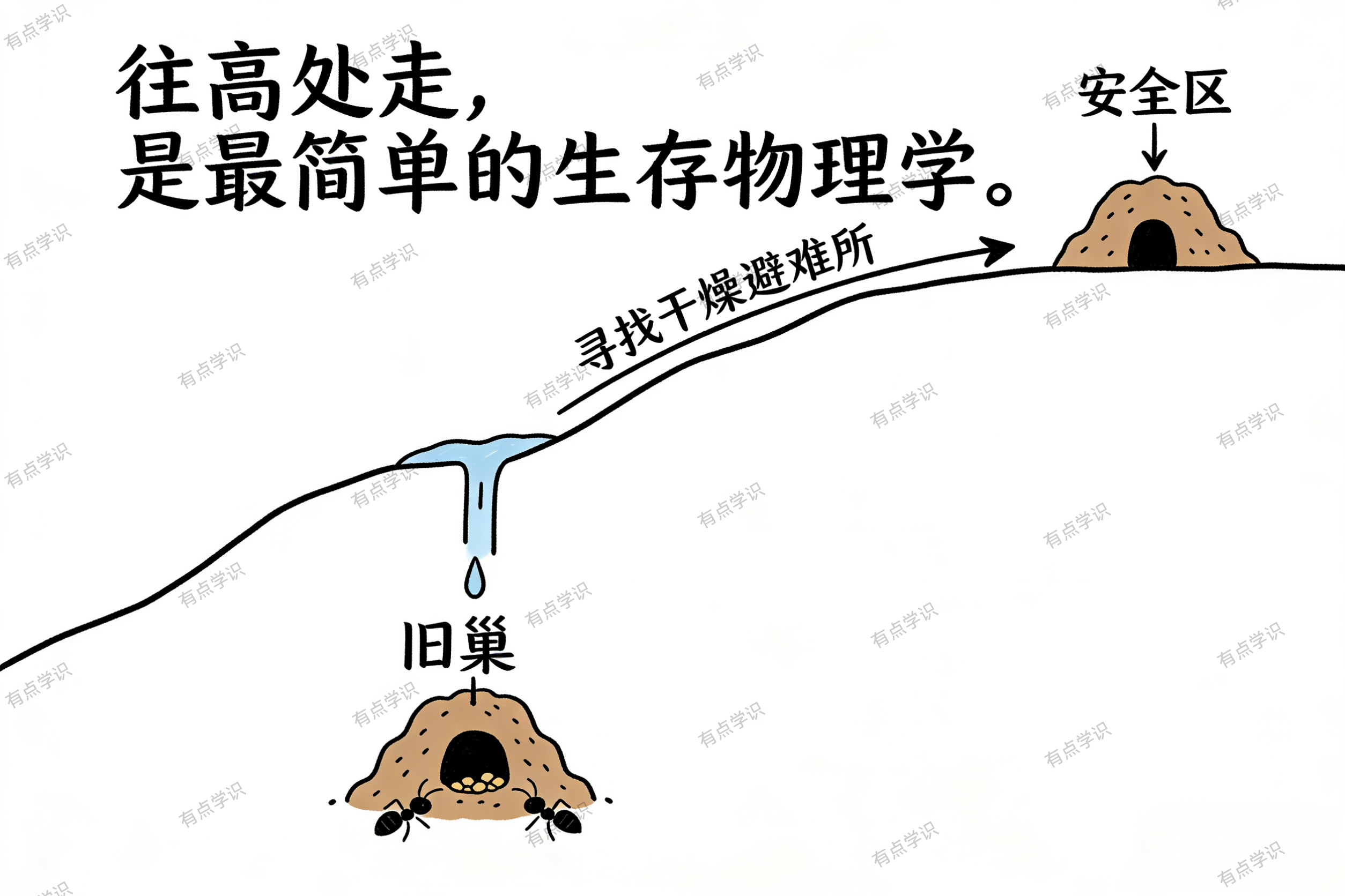 水往低处流。蚂蚁的巢穴多为地下结构,雨水极易灌入造成灭顶之灾。向地势更高处迁移,是为了寻找更干燥、不易积水的土壤区域重建巢穴,这是最直接有效的防洪策略。