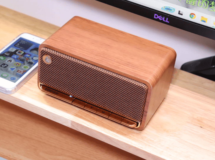 这款蓝牙音箱的外观非常有特色,采用全实木材质,结合复古造型和木材独特的纹理,呈现出一种浓厚的经典质感。无论放在家中哪个角落,都能瞬间提升空间的品味,兼具艺术与功能性。