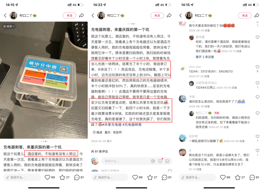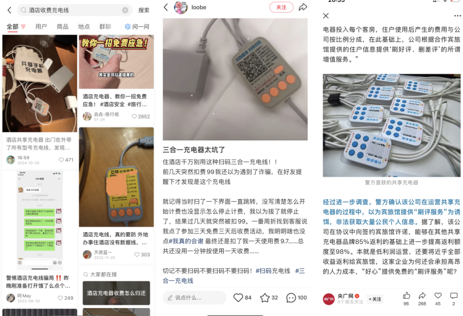 更麻烦的是,近期频繁有媒体曝光酒店共享充电线存在 “灰色交易”:自动续费、虚假扣费、信息泄露等问题层出不穷。