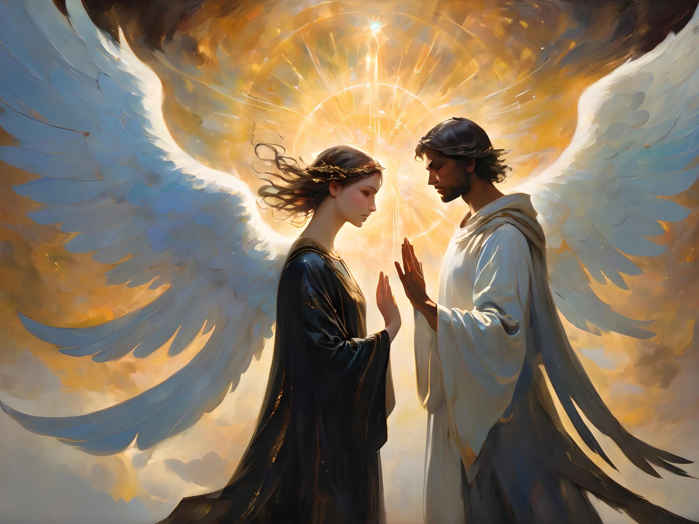 就这样,最初的意象从心灵深处诞生——那守护与指引之力生出了翅膀与明亮面容,而播撒猜忌与纷争之力则化作双目燃烧的暗影。